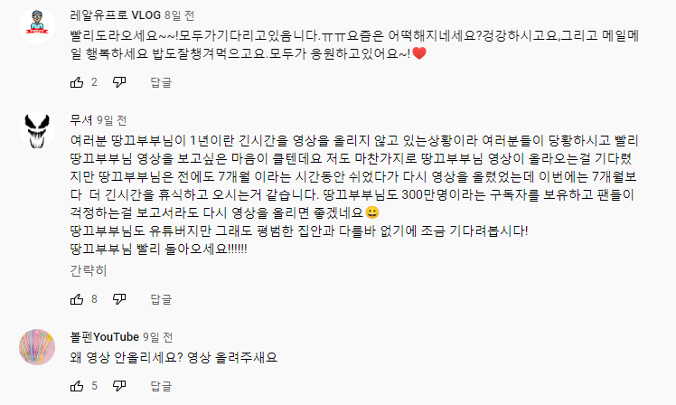 유튜브 커뮤니티에 잘 있다는 안부인사만 전해줘도 애청자들이 안심할 수 있을 것이라고 생각합니다.